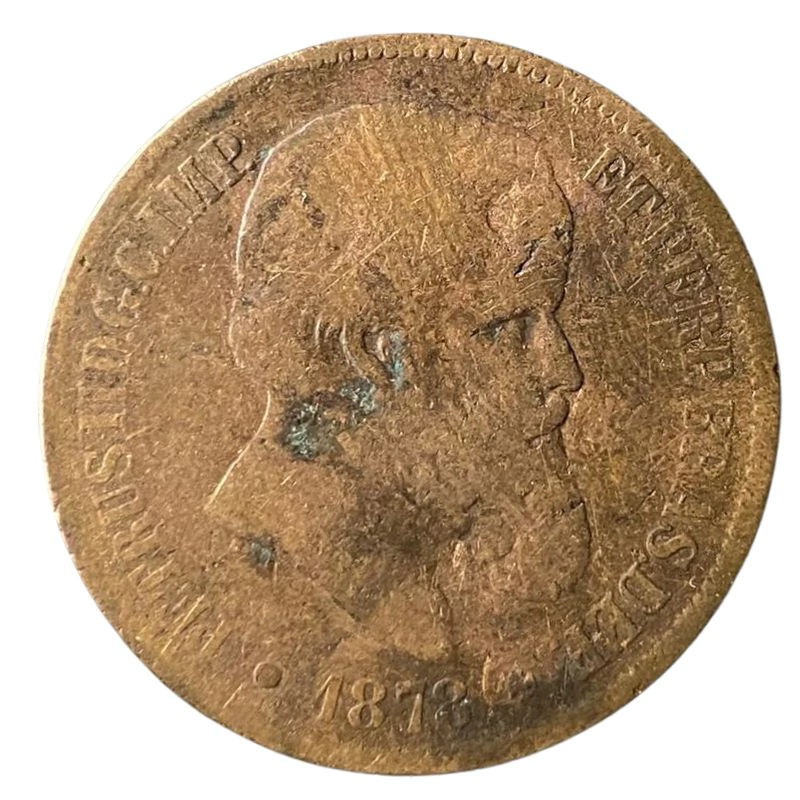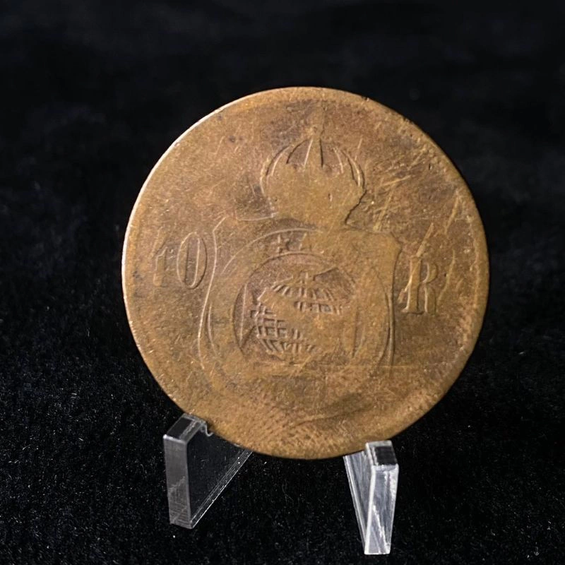 Moeda de bronze emitida durante o Segundo Reinado do Brasil, sob o governo do Imperador Dom Pedro II (1831–1889). Introduzida na circulação a partir de 1873, a peça de 40 Réis foi criada como uma opção intermediária entre os valores mais baixos da época. Cunhada exclusivamente pela Casa da Moeda do Rio de Janeiro, destaca-se pelo busto de Dom Pedro II voltado à direita e pela ausência de letra monetária. Seu gravador foi Ernesto de Souza Reis Carvalho, cujas iniciais (E.S.R.C.) aparecem discretamente abaixo do busto do imperador. Composta por bronze, apresenta 12 gramas de peso, diâmetro de 30 mm, bordo liso e orientação reversa.